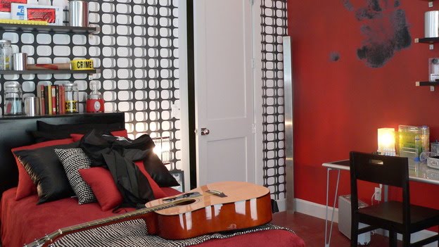El dormitorio juvenil tiene una impresión de mano gigante sobre la pared y cinta de no pasar por toda la pared. Los diseñadores se inspiraron en los gustos de la joven dueña del dormitorio que tiene que ver con investigación de crímenes y cosas así.